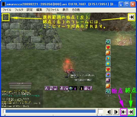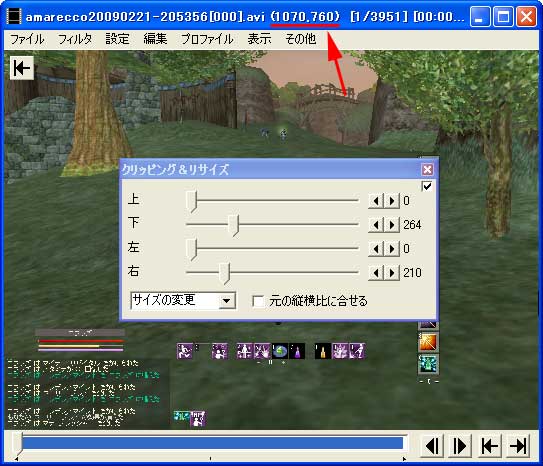 AviUtlを使って、アマレココで撮影した動画から、必要なシーンを切り出します。ついでに会話ウィンドウなんかの必要ない部分を切り取ってしまいましょう。