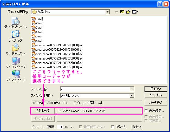 終わったら、ファイル → AVI出力 で、任意の名前を付けて保存してください。「ビデオ圧縮」は未圧縮か、せっかく撮影時にUt Video Codec Suiteをインストールしたので、「Ut Video RGB(ULRG)VCM」とかになってるといいですね。容量少なくて済みますし、無劣化なのでこういった中間作業にも安心です。