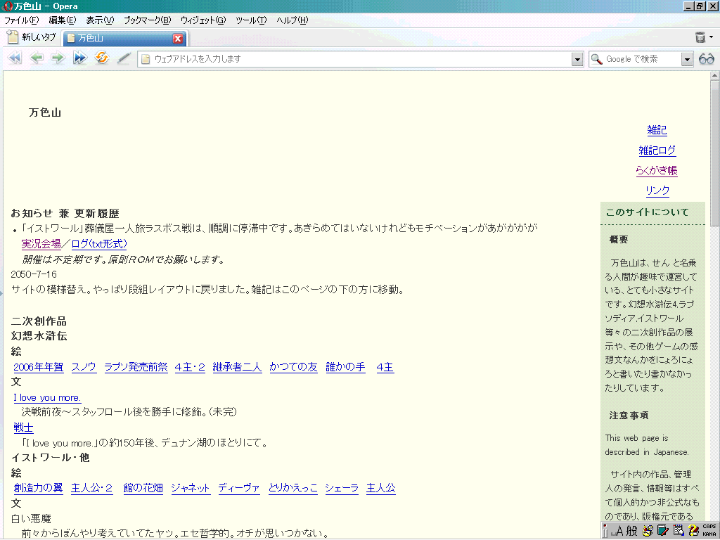 あとは配色とかhnタグ周りのデザインとか考えたり、リストマークとっかえひっかえしてみたり、タイトルロゴ作ってみようとか考えてみたり、インデックスとリンク用のcssだけじゃなく全ページにインポートしてるcommon.cssもちょっと書き換えちゃったから作品展示ページ用img.cssも調整しなきゃならなかったり、実は文章モノ用のtxt.cssだけはすで完成していたり、今思い出したんだけどそういえばruby周りだけ放置してたからこの辺(暁に死す)を参考にさせていただいてjavascriptでルビを振ってみるかと思ってみたり、やっぱめんどくさいからルビは止めようかと考え直してみたり、要するにどういうことかというと、まだまだまだまだ完成しそうに無いってこってす。